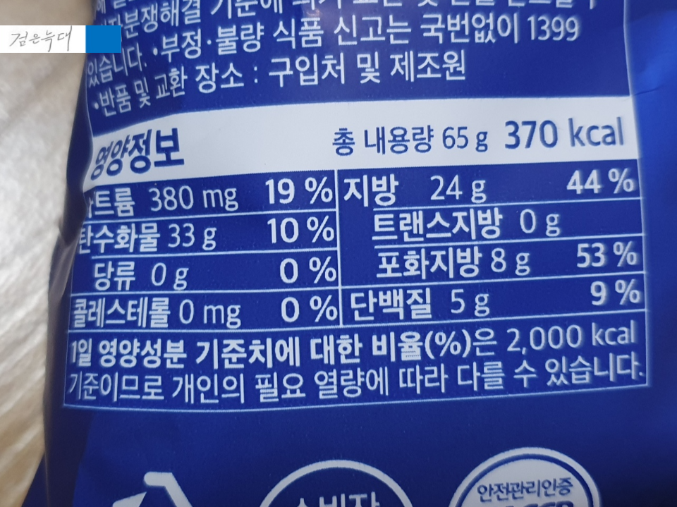용량은 65g 열량은 370kcal 입니다