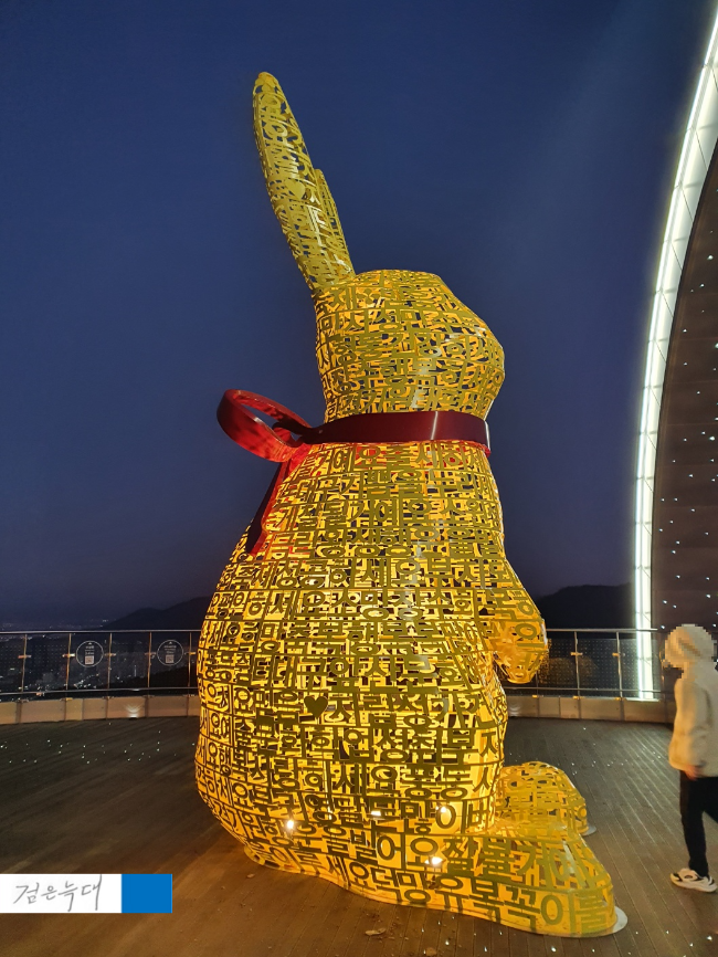 대구 노을맛집인 앞산전망대 탁 트인 전망대라 노을이 예쁜만큼 대구일출명소로도 유명한데요 최근에 리모델링 후 재개장 하면서 토끼 조형물이 생겼습니다 남구에서 노린 건지는 모르겠지만