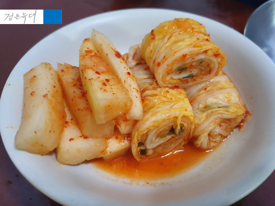 기본 반찬인 김치롤과 깍두기입니다