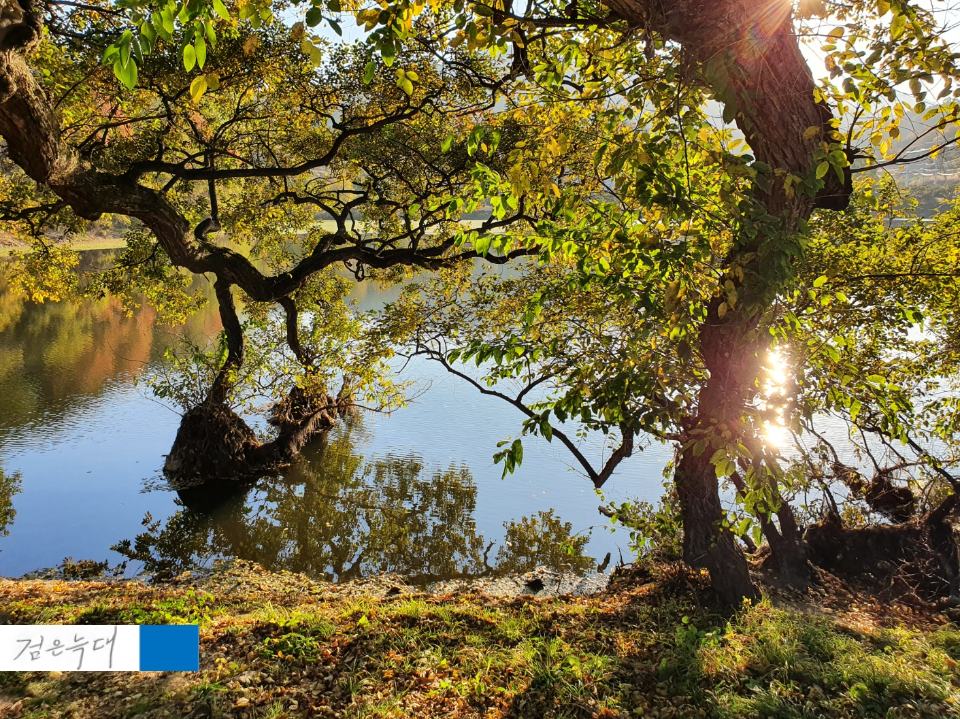 큰 나무들과 저수지가 어우러진