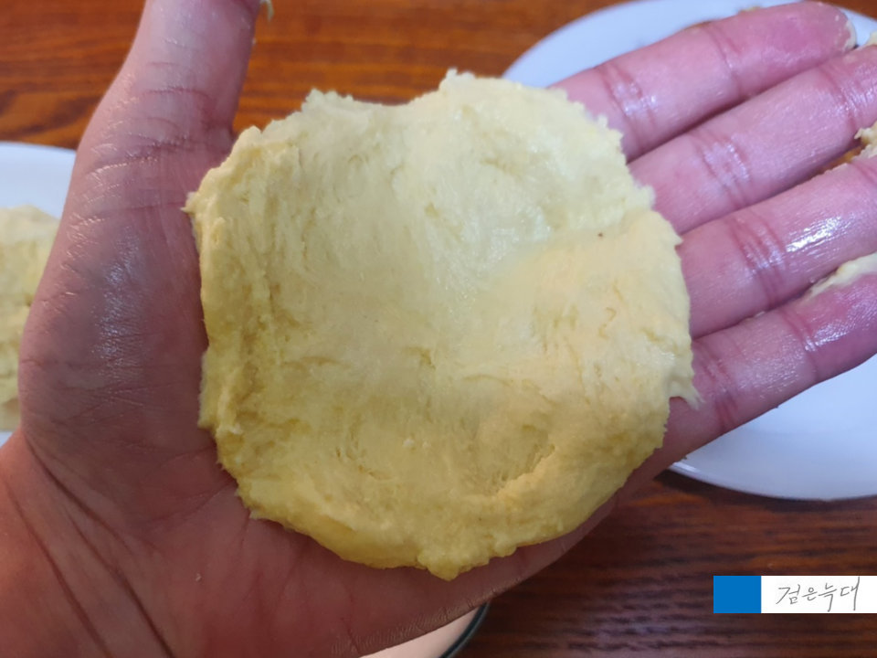 가루 날려 반죽해야 돼 손에 기름 묻혀야 돼