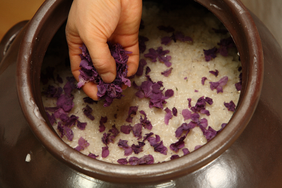 누룩과 찹쌀에 진달래꽃이 조금 들어가고