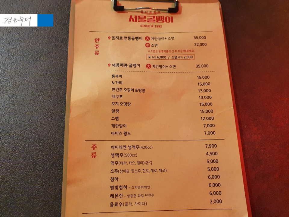 서울골뱅이타운의 메뉴판입니다