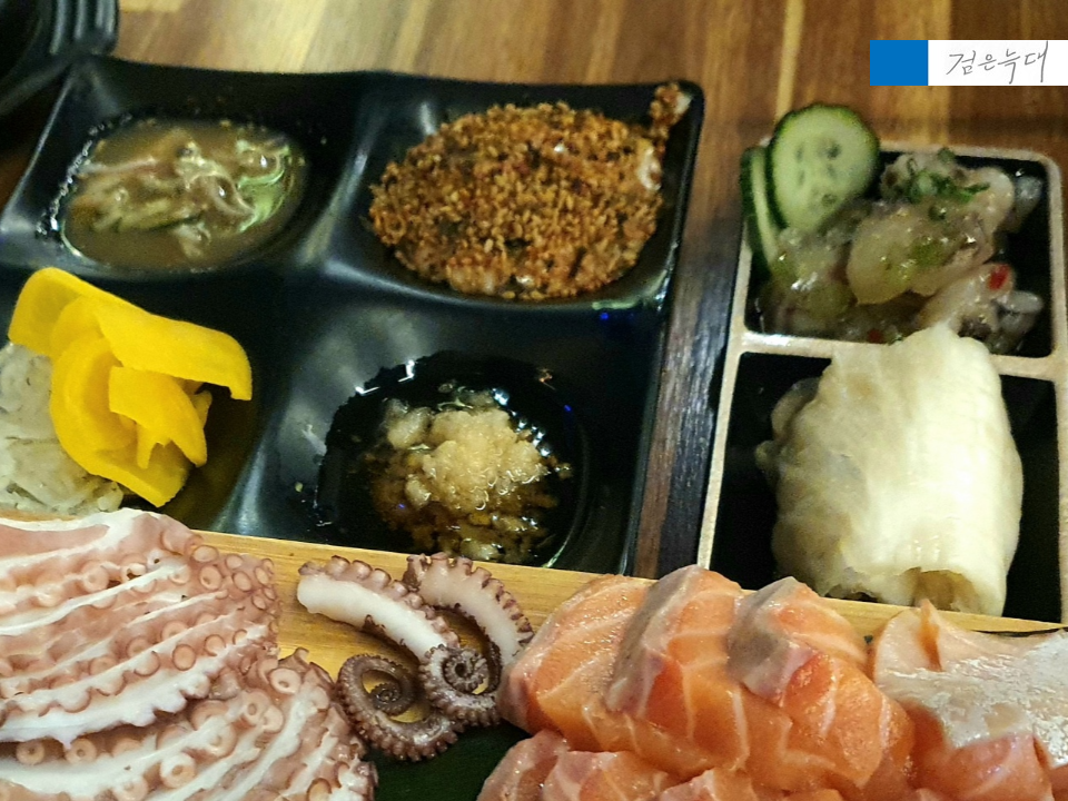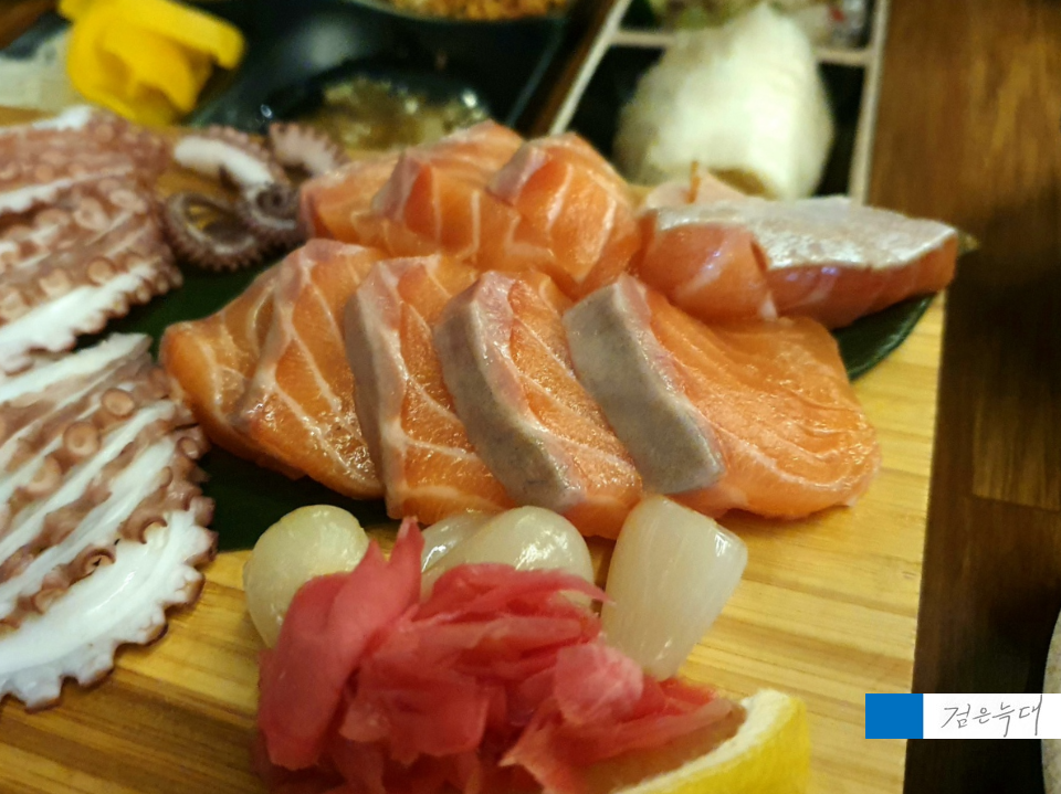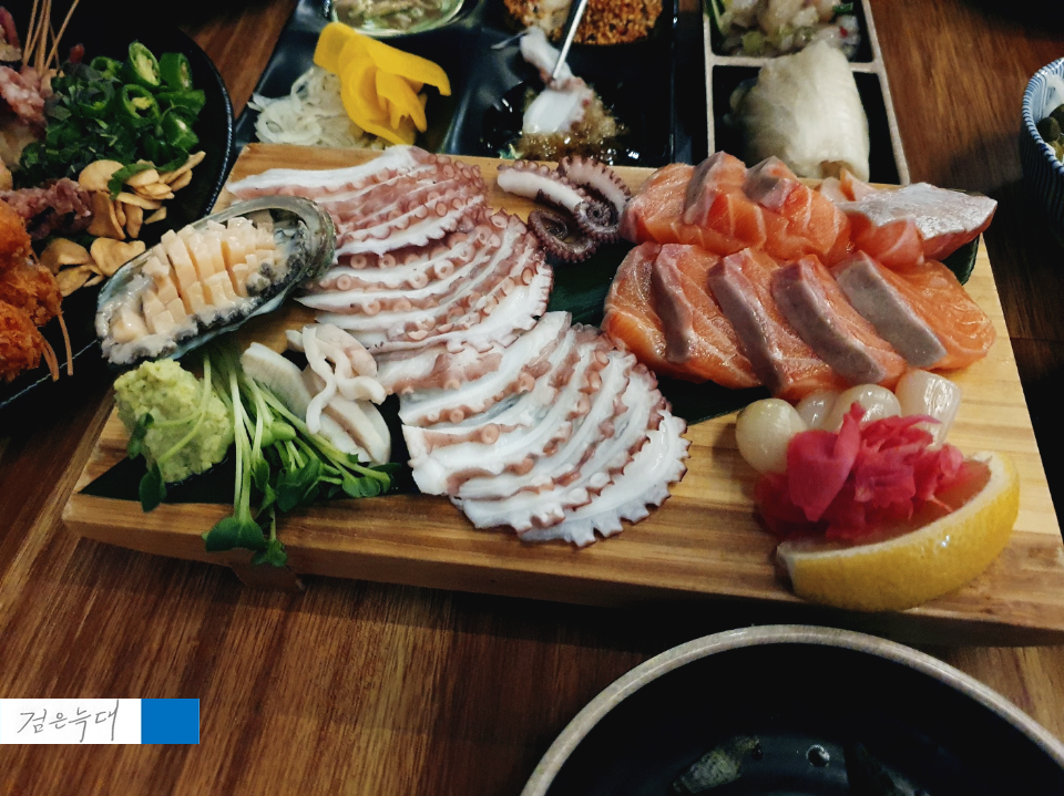 문어숙회, 문어튀김, 연어사시미, 타코와사비,