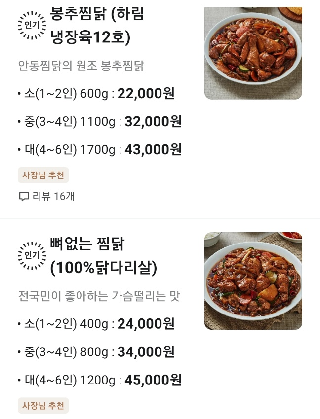 뼈없는찜닭 두가지가 있는데