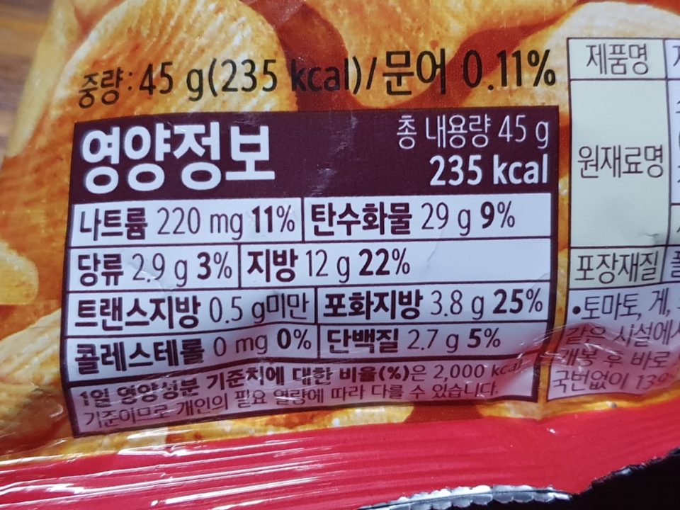 중량은 45g 열량은 235kcal입니다