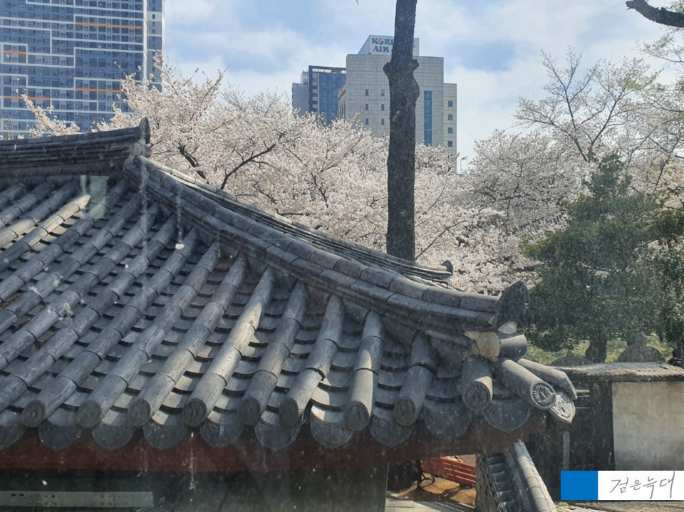 한옥의 지붕과 벚꽃