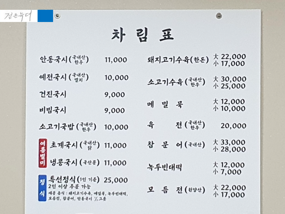 안동국시 본점의 메뉴판입니다