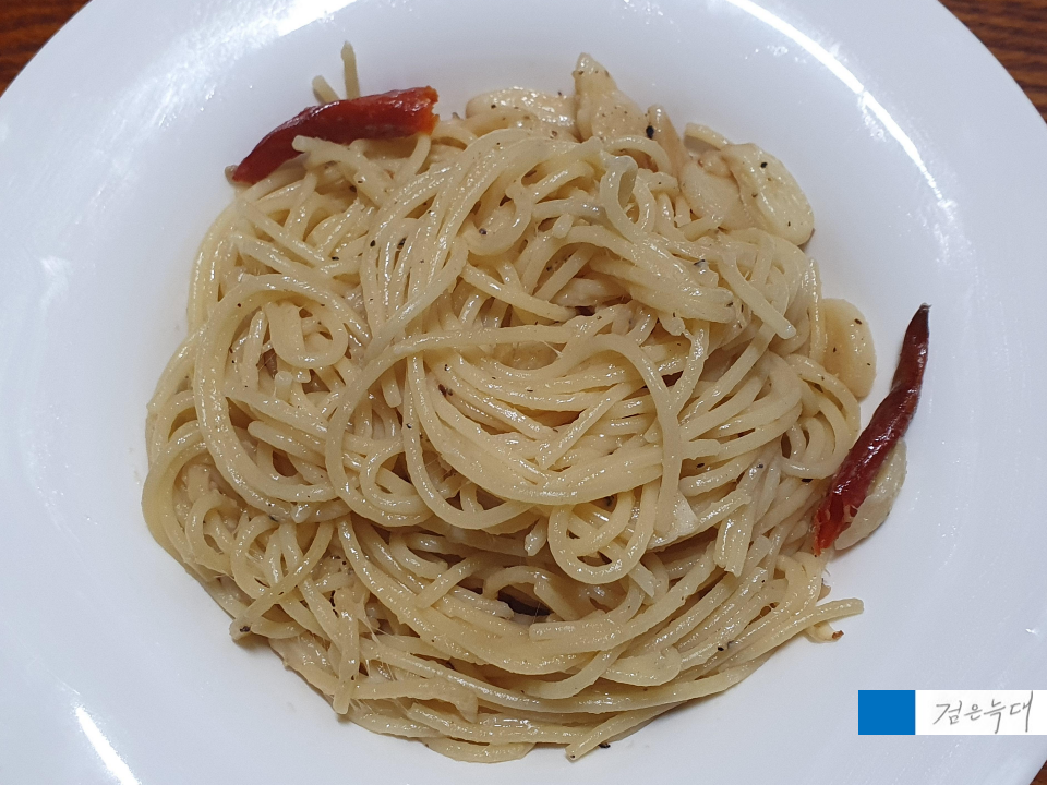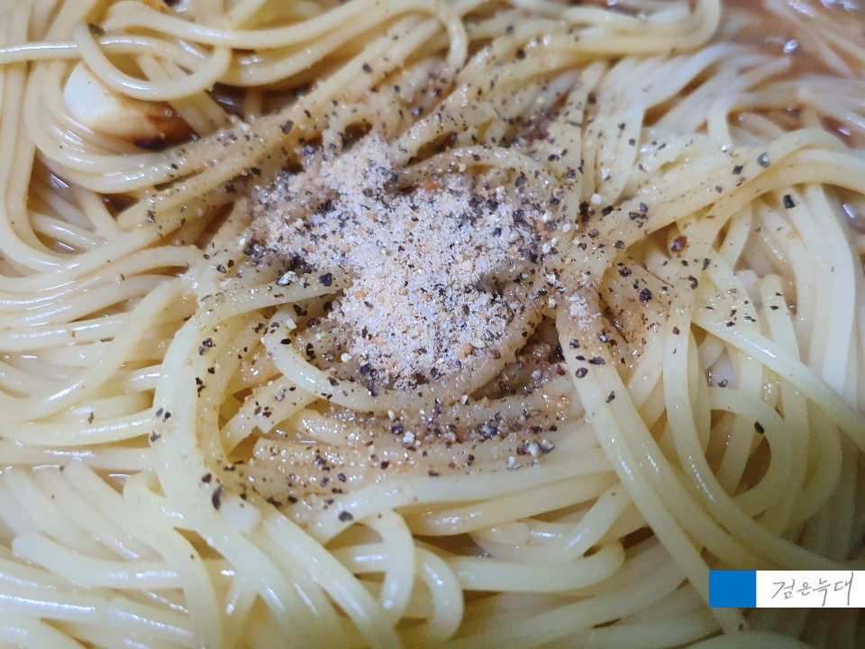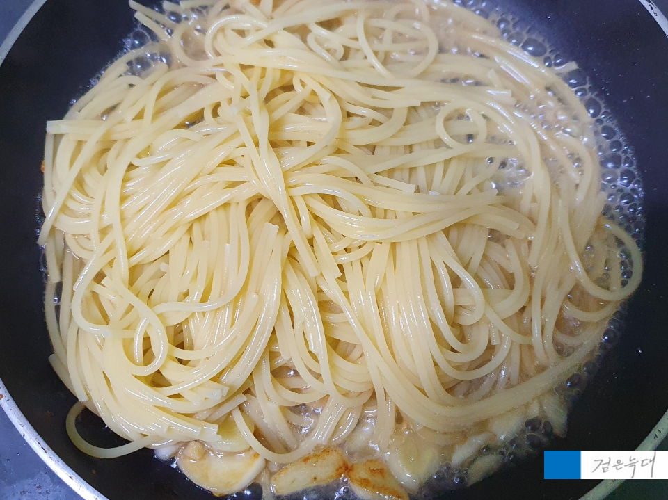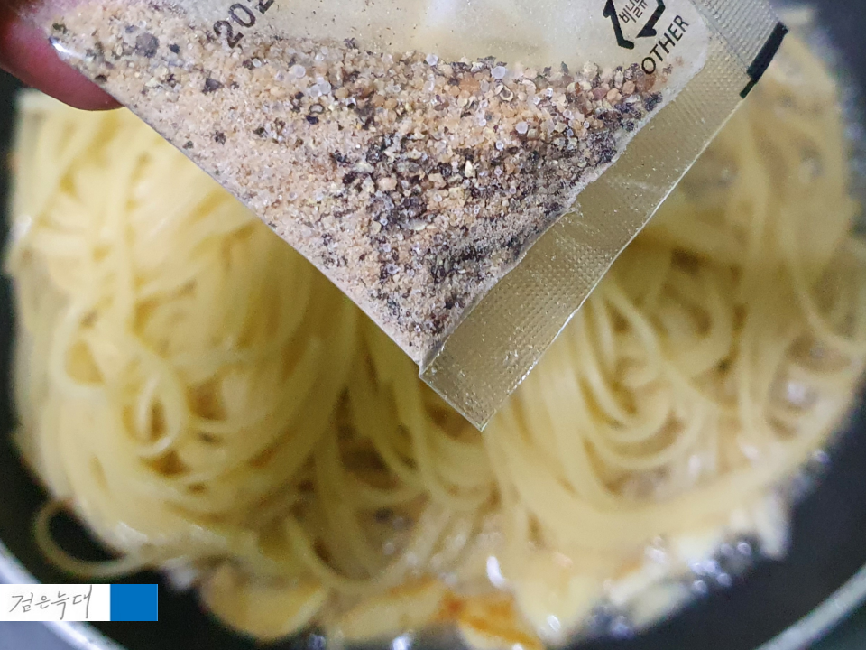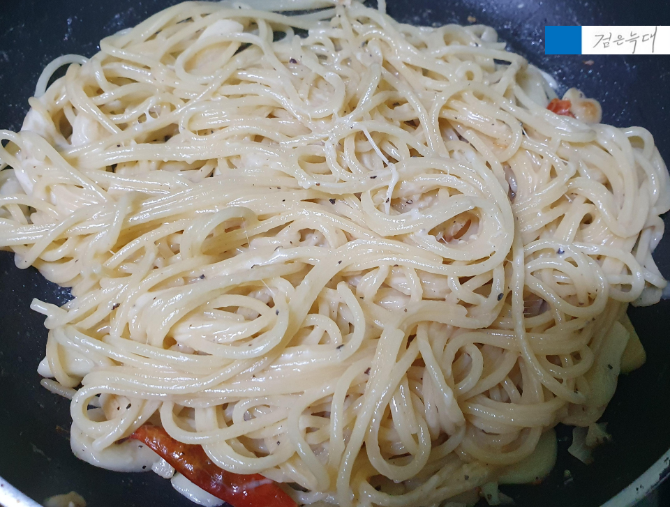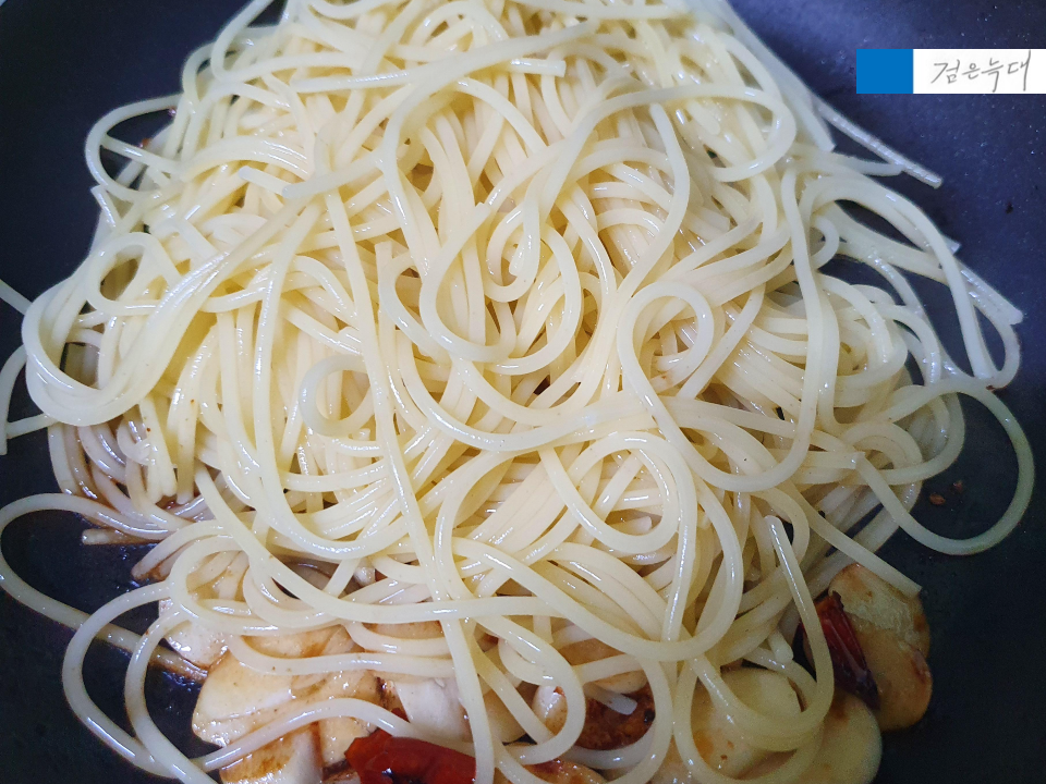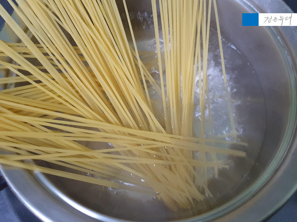 아까 파스타를 익힐 때 넣고 남은