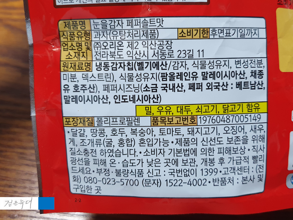 눈을감자페퍼솔트맛 원재료입니다