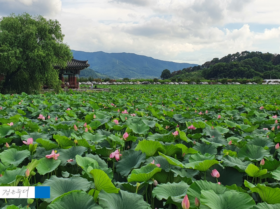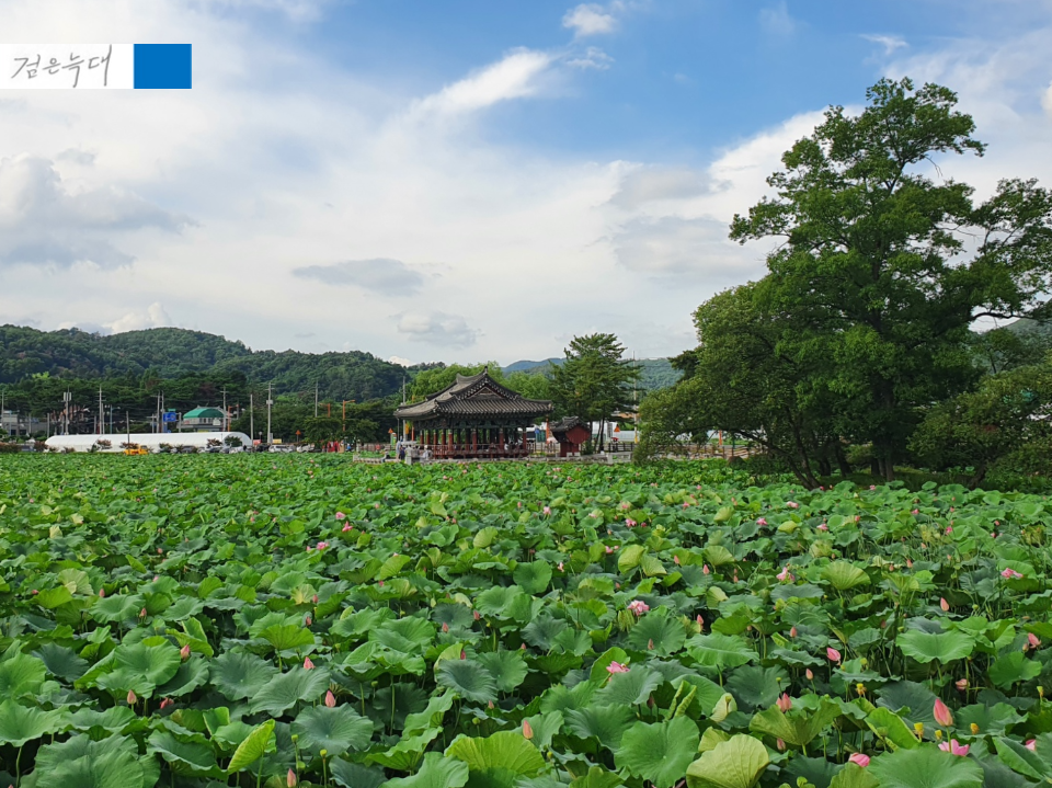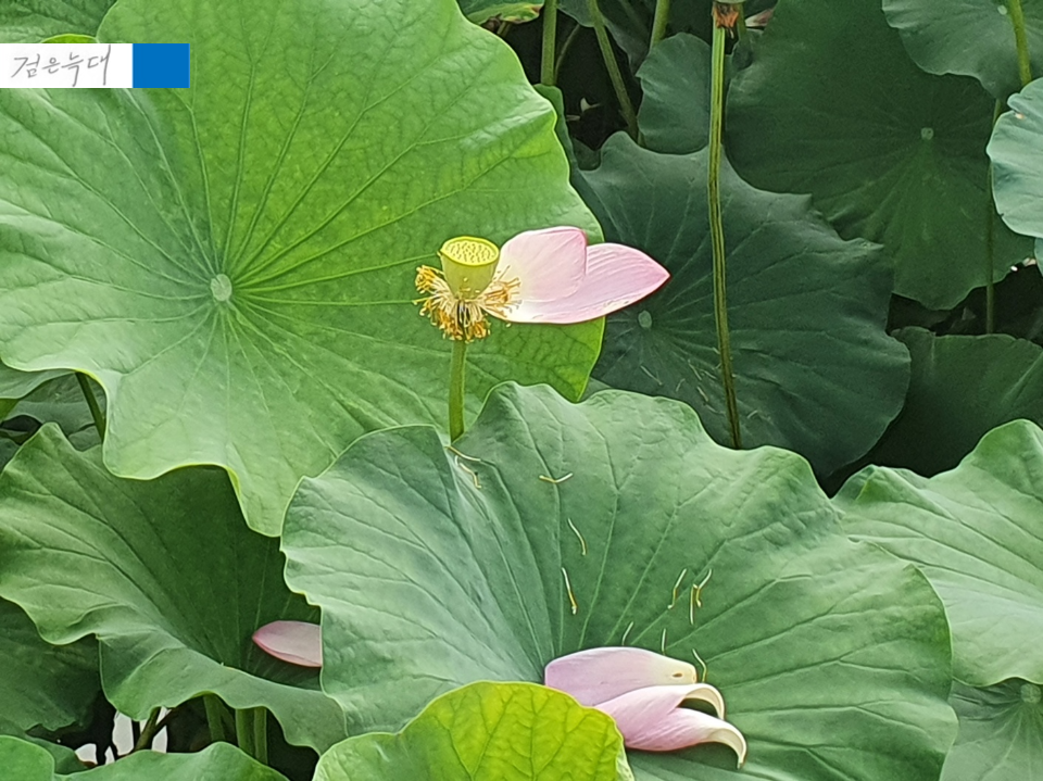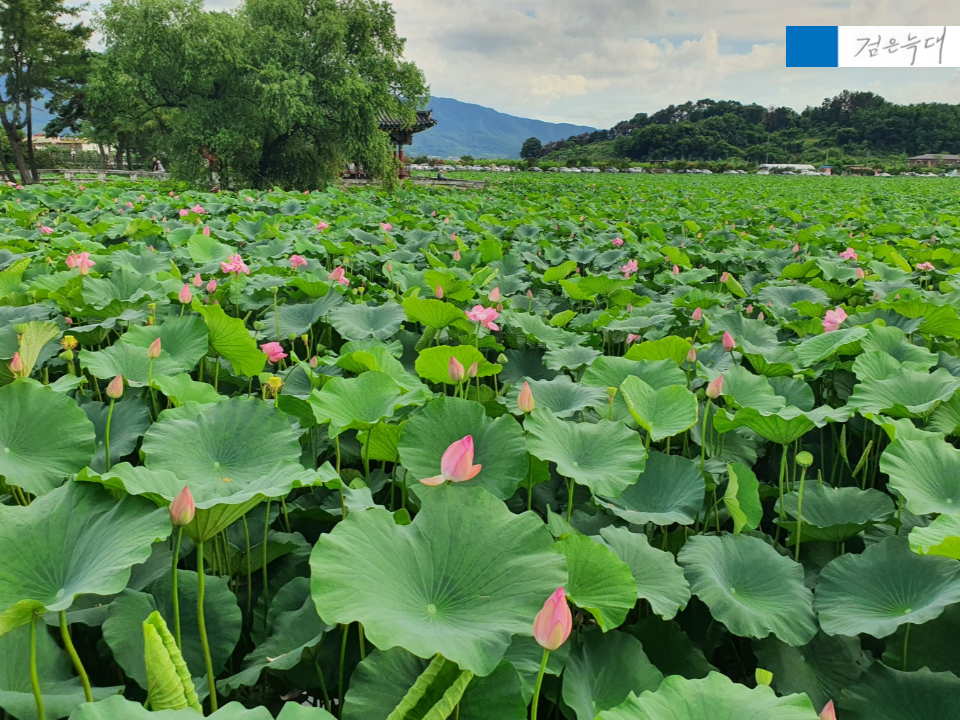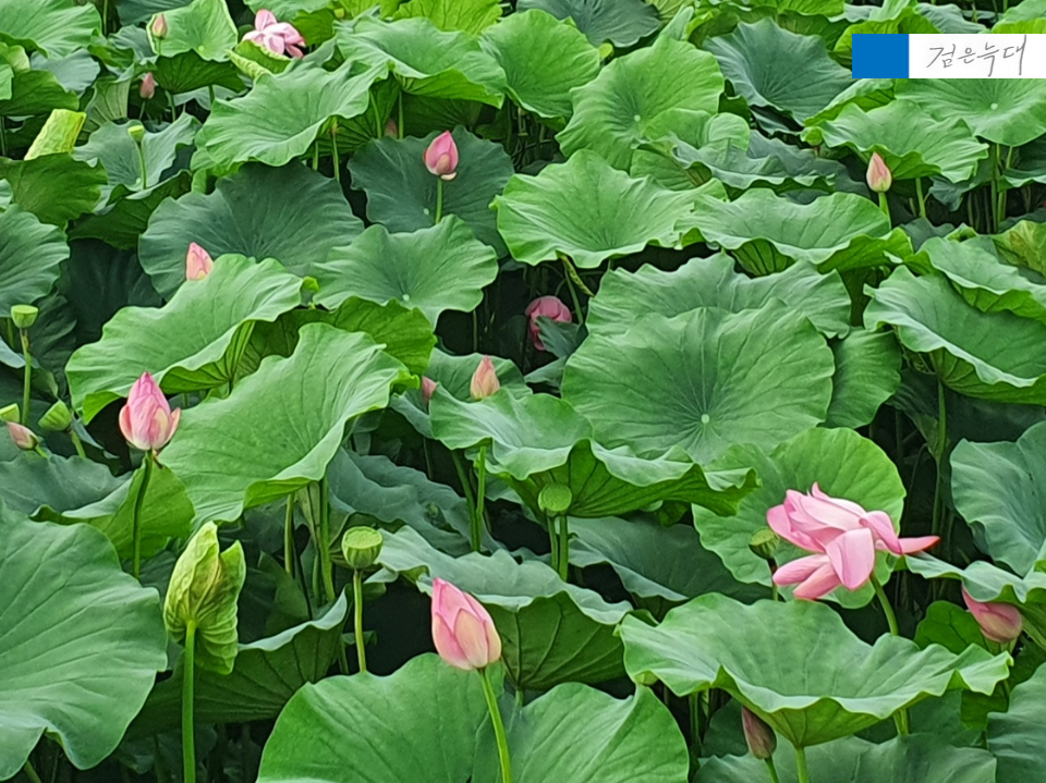 여름의 활짝 핀 연꽃과 푸름이 가득한