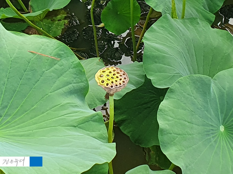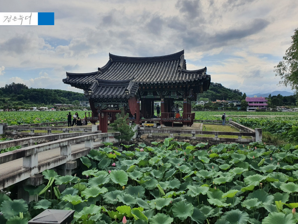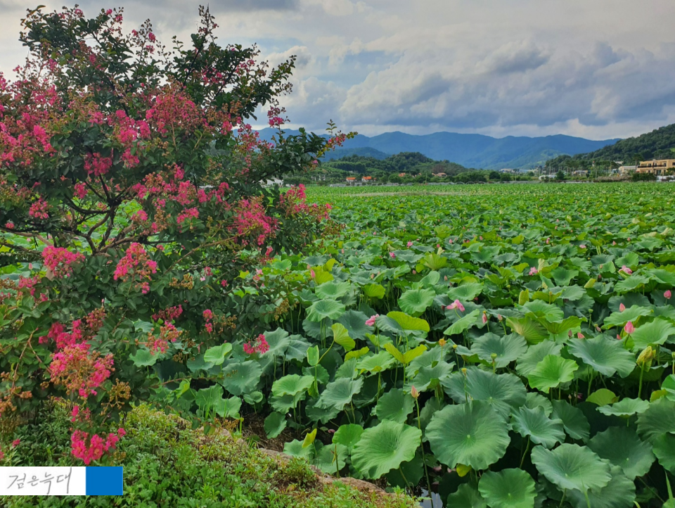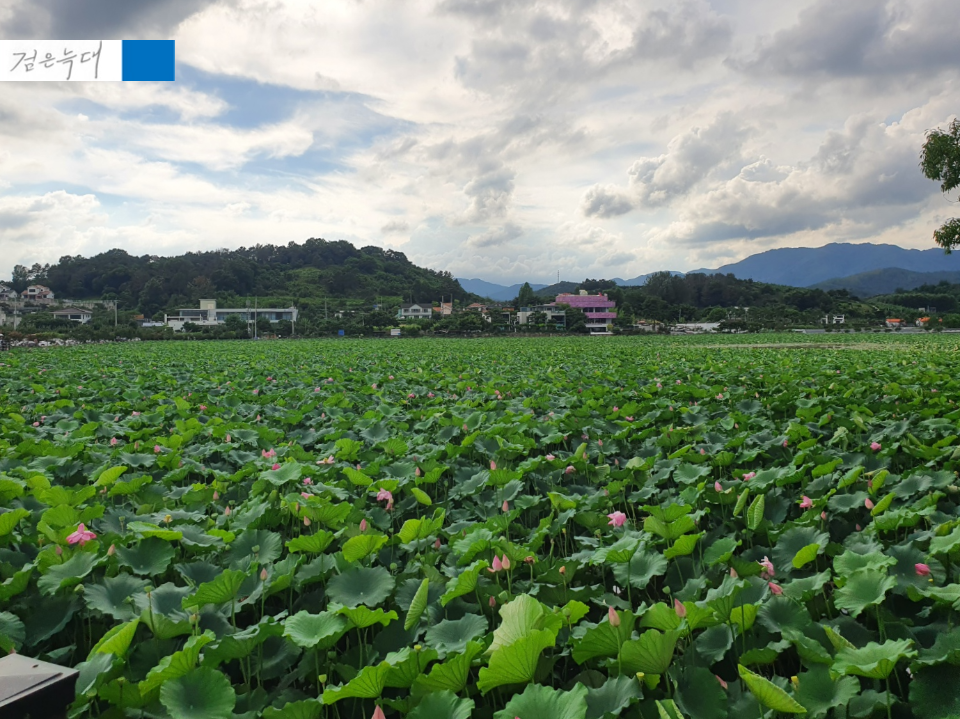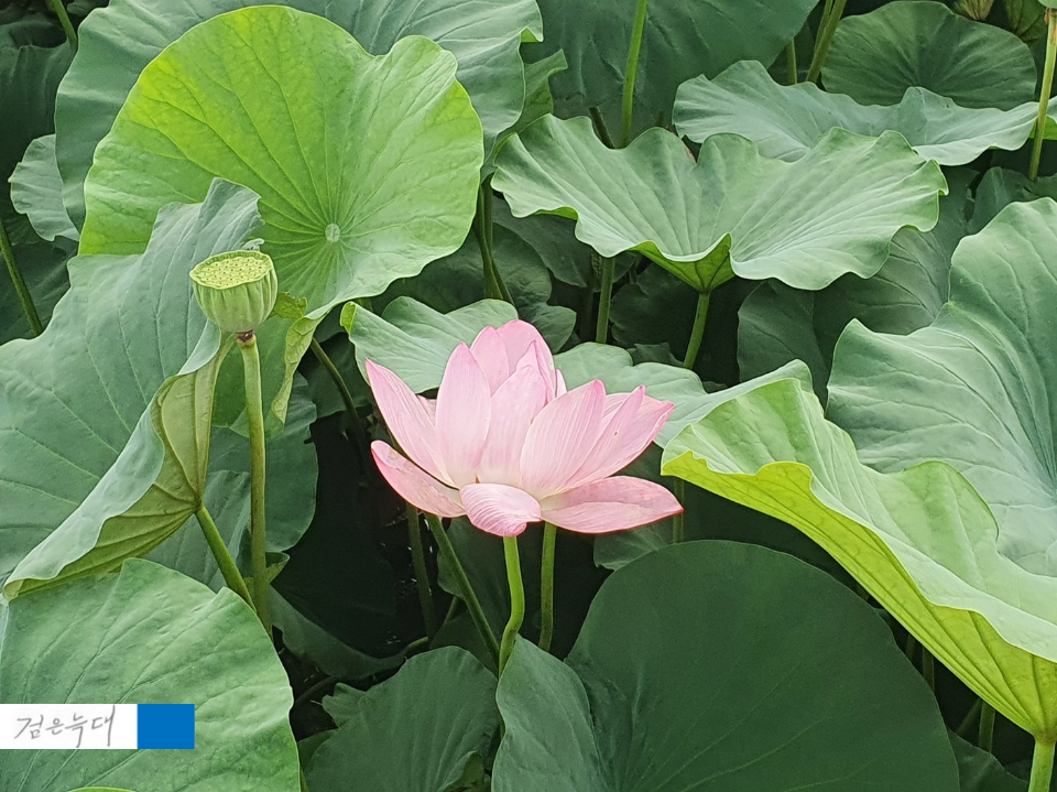 여름의 활짝 핀 연꽃과 푸름이 가득한