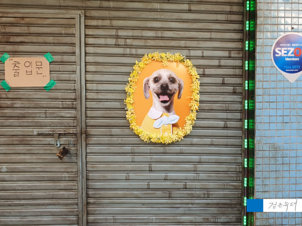 문 옆에 붙어 있는 강아지가