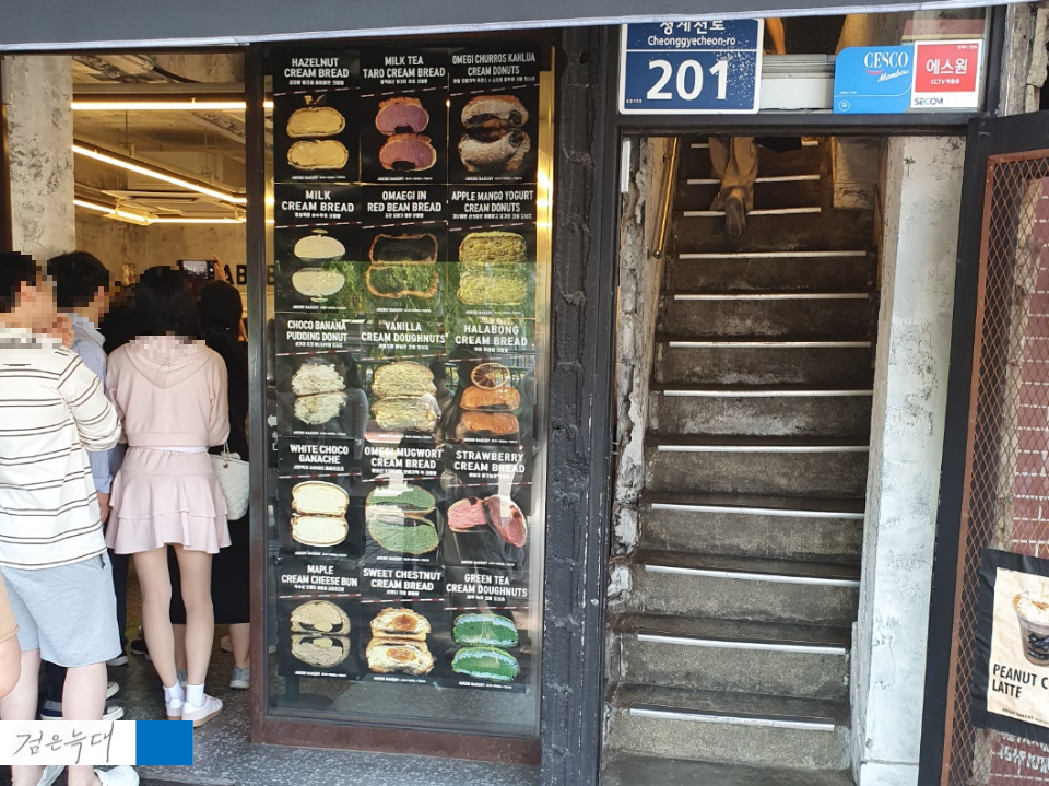 줄이 가득한 빵집을 하나 보게 되었어요