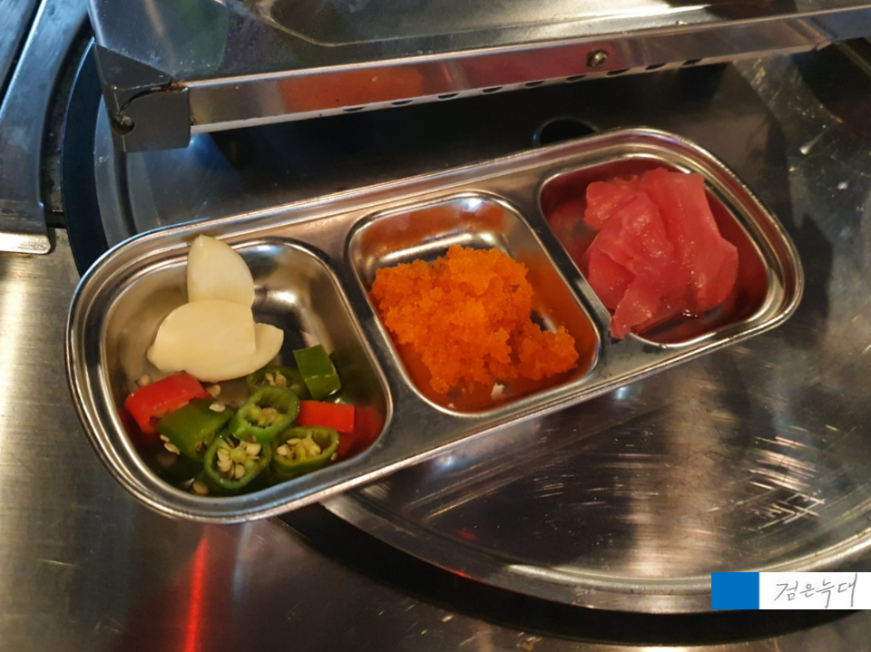 마늘, 고추, 날치알, 초생강이 나옵니다