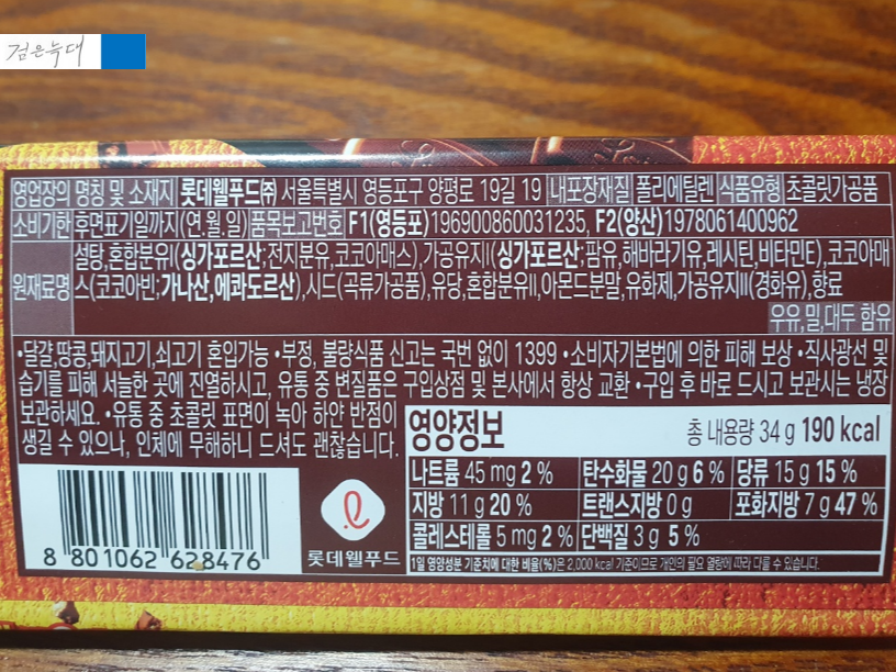 롯데 크런키 초콜렛의 뒷면을 보면