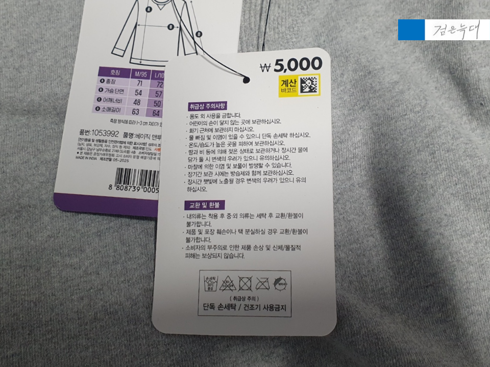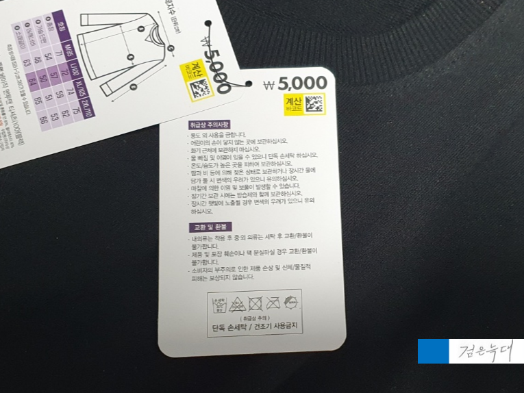 주의사항이나 세탁방법이 적혀 있습니다