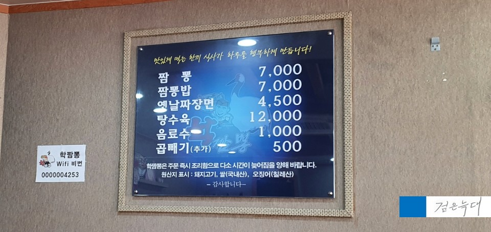학짬뽕 본점의 메뉴판