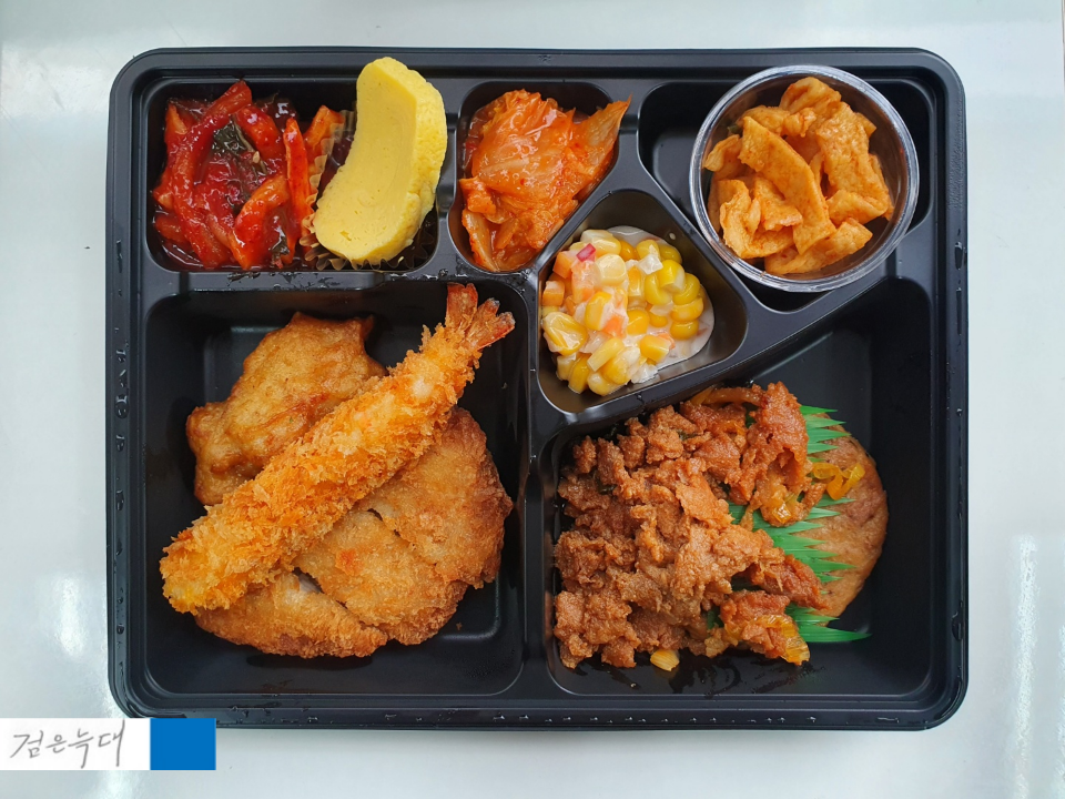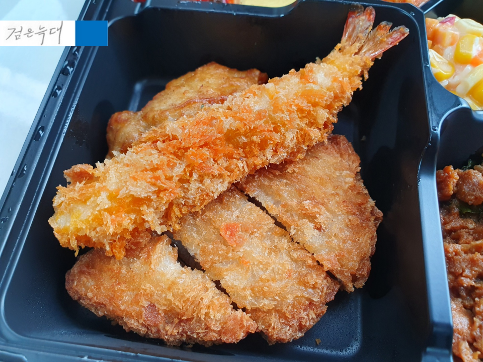 한쪽에는 돈까스, 새우튀김, 치킨가라아게