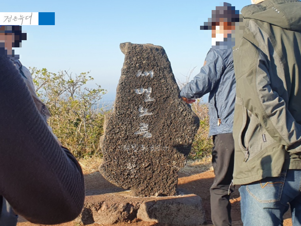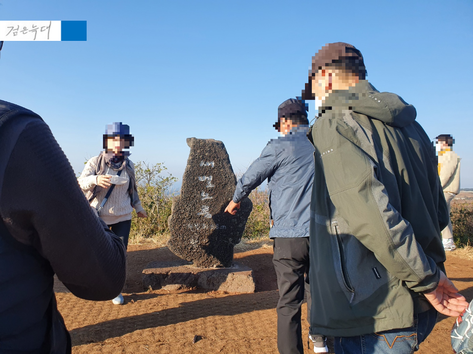 정상에는 새별오름 정상석 앞에서