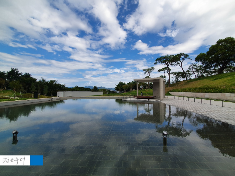 파란 하늘과 연못에 비친 풍경이