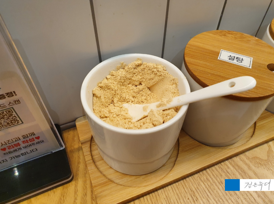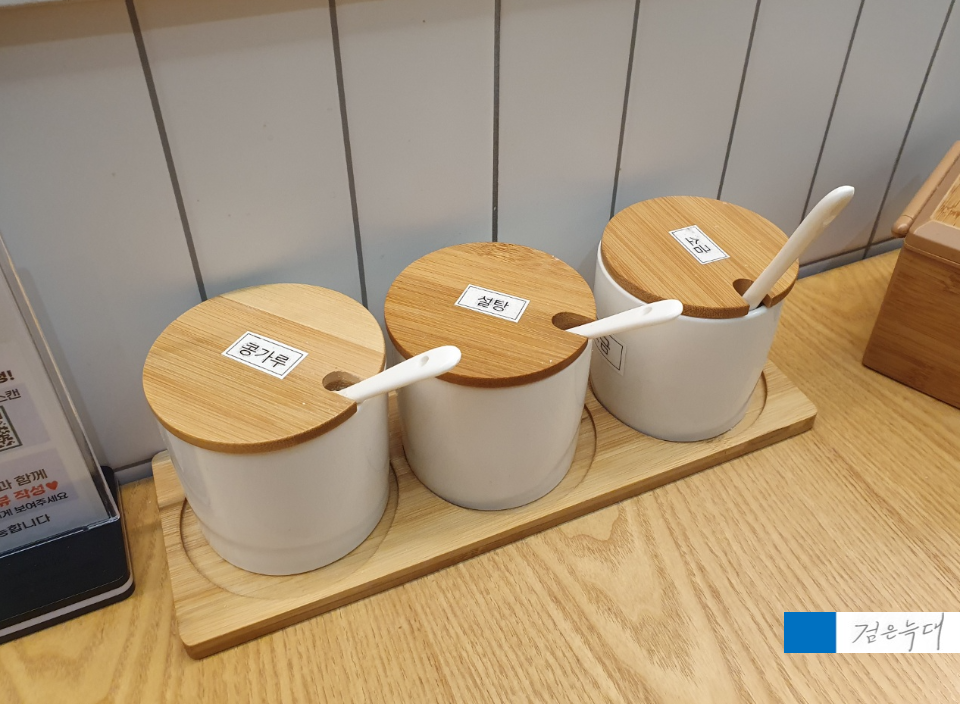 각 테이블에는 콩가루, 설탕, 소금이