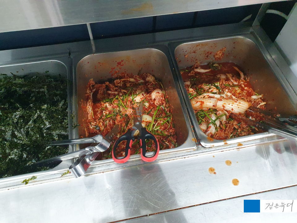 김치와 김가루, 앞젚시, 생수 등이 있습니다