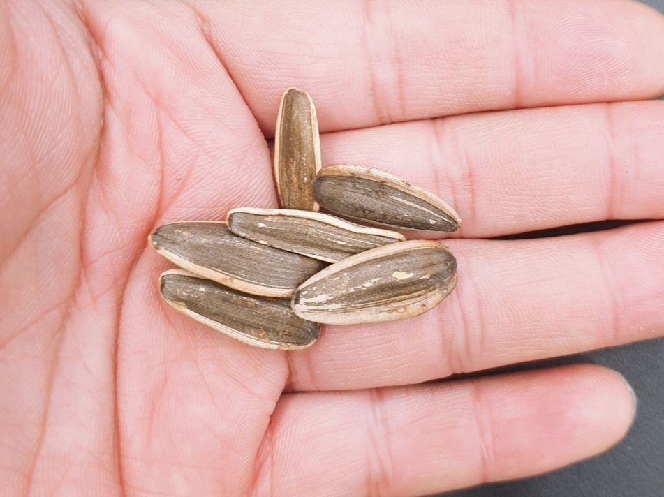 이로 해바라기씨 끝부분을 살짝 깨물면