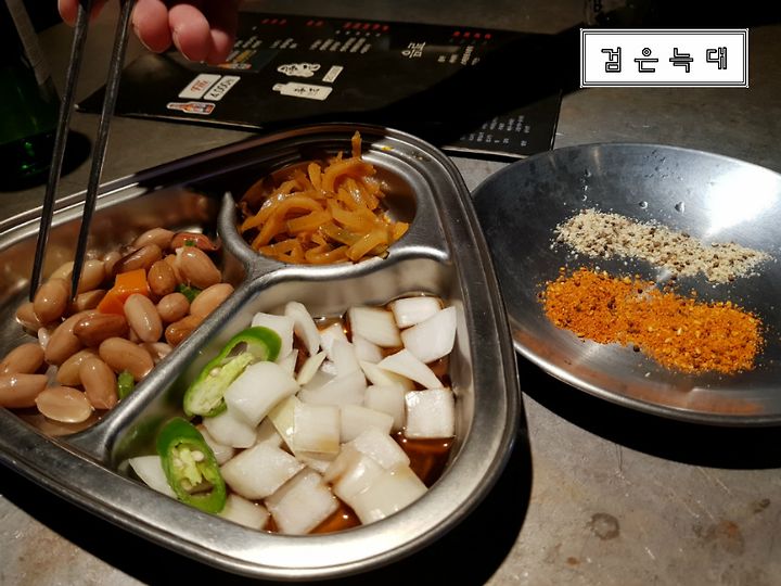 절인 양파 땅콩, 박나물 볶음이 나옵니다