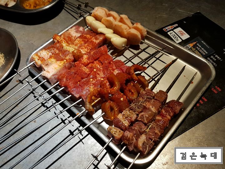 양꼬치, 돼지껍데기꼬치, 어묵꼬치, 마늘꼬치로